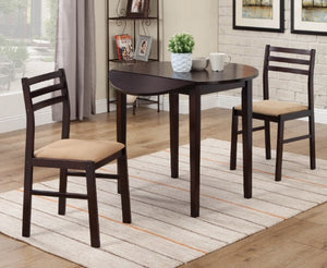 Elevate the tasteful look and feel of a dining nook or parlor with this chic, stylish dinette set. Its compact size and sleek design blend effortlessly into rooms of all shapes, sizes, and decor styles. Soft, cream colored upholstery covers the plush, padded seats of its two comfortable chairs. The classic glamour of its round, wooden table is enhanced by the versatile functionality of a convenient folding leaf. A deep, rich cappuccino finish and sleek, graceful lines complete the glamorous look of this elegant three-piece set.