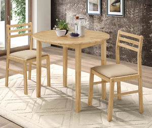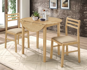 This lovely dining set lends an elegant touch of simple sophistication to a kitchen or breakfast nook. It comes complete with a lovely, round dining table and two comfy chairs upholstered in soft, light brown, padded fabric. The table is enhanced by a versatile drop-down extension which can be raised to accommodate an elaborate dining setup. Lowering it allows you to cozy up closely with a special someone over a leisurely breakfast or romantic, candlelit meal. A smooth, polished, natural wood finish gracefully complements the sleek, stylish silhouette of this beautiful three-piece set.