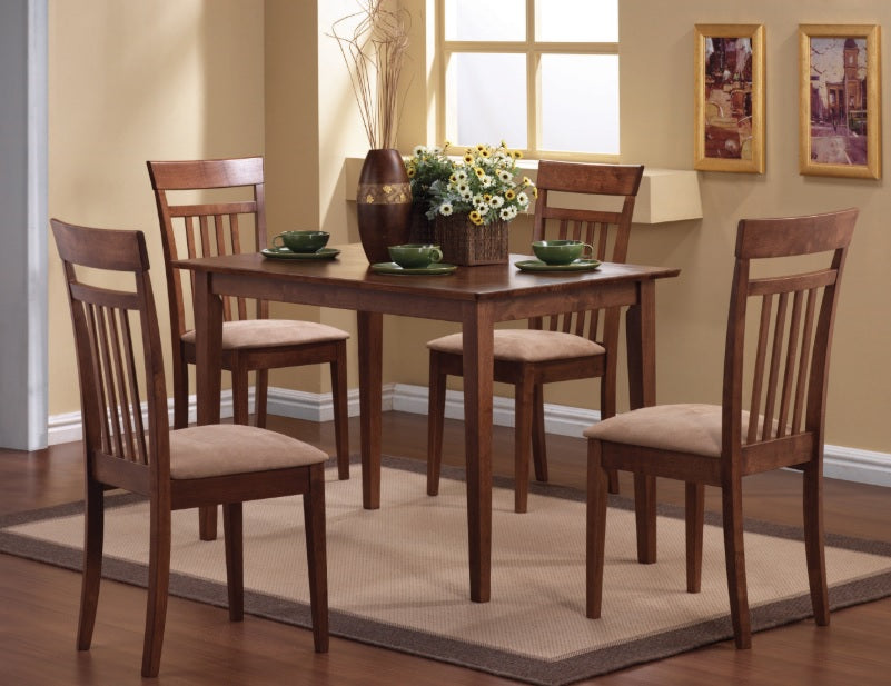 Gather your loved ones round to experience the luxurious comfort and elegant style of this five-piece dining set. This sleek, classically designed set comes complete with one table and four chairs. Clean and subtly curved lines create a minimalistic rectangular dining table. A handsome slatted wood backrest adds flair and dimension to its chairs. Cushy, comfy padded seats are covered in soft, beige fabric that feels exquisite to the touch.