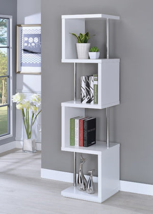 Go with the flow in a modern space with an edgy, artistic look. This four-tier bookcase is a great option for a compact space. Enjoy a modular, geometric silhouette and a choice of finishes. Steel supports reinforce shelving that hosts books and decor. Choose from finishes that intensify the attitude of your custom space.