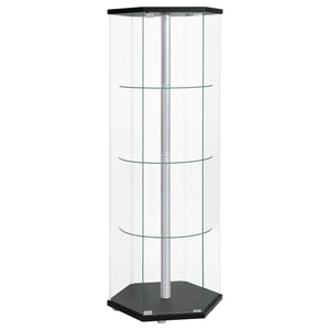 Explore the cutting edge properties of geometric design. Made from glass, this curio cabinet wakes up a contemporary space and puts a new spin on an old classic. Hexagonal in shape, it features a cool center pole for visual effect. A black finish top and base provide superb contrast. Display favorite decor on a trio of round glass shelves.