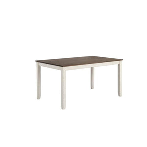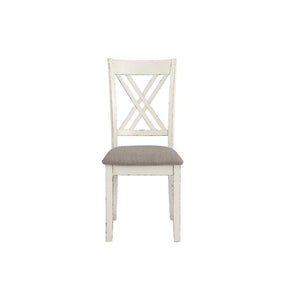 Product Description Complete your modern farmhouse dining room with this seven-piece dining set. Complete with one dining table and six side chairs, it offers a matching vintage white finish that lends a country charm. The spacious, rectangular dining table also features a chestnut colored, sandblasted wood tabletop with a dry brushed weathered finish. Each of the six chairs have a sturdy solid wood frame and flared backrests with open double-cross designs. Rest comfortably on their cushioned seats, wrapped in a high performance fabric in a grey hue that complements numerous color palettes.