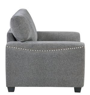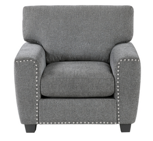 Enhance your living space with this versatile and stylish gray Chair. Featuring reversible back and seat cushions, this chair offers extended comfort and longevity, allowing you to easily refresh its appearance. The textured dark gray fabric upholstery complements a variety of décor styles, while the nailhead trim detailing adds a touch of sophistication. The sturdy block feet provide a stable foundation, making this chair a perfect addition to your living room, reading nook, or bedroom. Enjoy the perfect blend of comfort, style, and practicality with this contemporary accent chair.