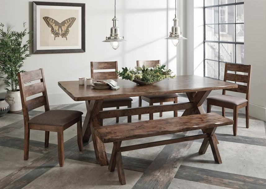 - Tabletop and dining bench feature X bases and hand-planed edges for a handcrafted live edge look