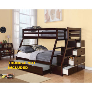 The Jason Bunk bed with storage ladder and optional trundle was designed to offer function ability while saving space, this twin over full bunk bed is a perfect solution for your children's bedroom. Carefully crafted with selected wood and veneers in rich espresso finish, features full-length rails, its built-in staircase allows easy access to the top bunk, and is complemented by 5 storage drawers. The Jason Bunk Bed is a great addition to any youth room. A twin upper bed, full size bottom bed, and pull-out twin trundle bed offer lots of space for sweet dreams. Carefully crafted with selected wood and veneers in rich, classic espresso finish gives this piece a stylish look and makes it ideal for blending with an array of different designs. The final fabulous feature: a built-in staircase with storage drawers, is perfect for stowing away toys, clothes, linens, and so much more!