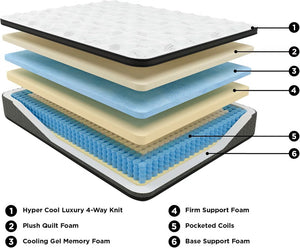 Enjoy endless possibilities for restful sleep on this Euro top mattress with hyper-cool technology. You get the best of both worlds with this hybrid innerspring mattress: the pressure relief of cooling gel-infused memory foam, coupled with body contouring pocketed coils for superior support. Rest assured that high-density quilt foam provides the comforting feel you love. Plus, this mattress arrives in a box for quick, easy setup. Just cut away the plastic wrap and unroll it. Foundation-box spring available, sold separately.