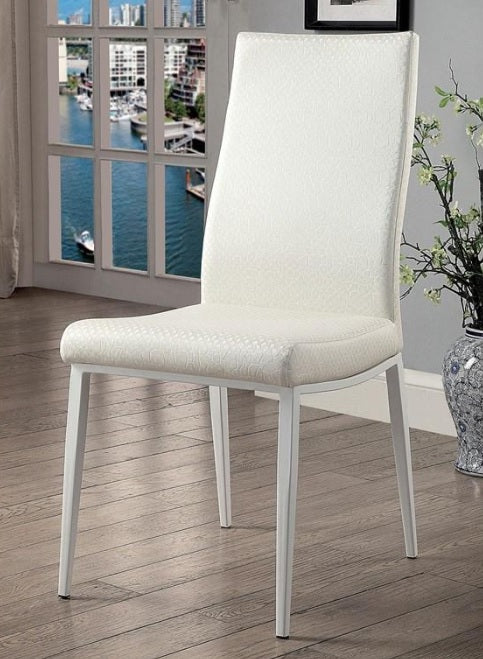 Simplify your dining room with clean lines and sheer sophistication. White finishes brighten and polish this dining set, creating a chic upscale ambiance. A sleek crocodile skin leatherette drapes the soft cushioned chairs and pointed legs are brushed with silver powder coating. Spruce up your dining room for a minimalistic aesthetic that delivers a powerful statement.
