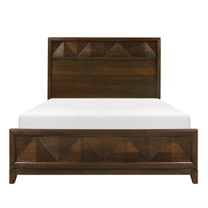The modern styling of the Aziel Collection features geometrical accent to present a bold profile perfect for the sophisticated look you wish to achieve in your bedroom. Walnut veneer is highlighted by walnut finish, light reflecting the wood’s grain with each angle change of the queen bed’s decorative fronts.