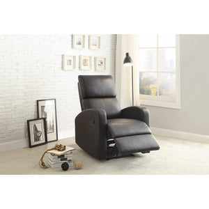 Whether utilized as an accent to your existing living room suite or as a stand-alone chair in your home, the Mendon Collection will add a modern touch to your space. Clean lines are covered in dark brown faux leather in this contemporary selection. The manual reclining mechanism allows you to reach a relaxed position with just the pull of a lever. Also available in taupe and black